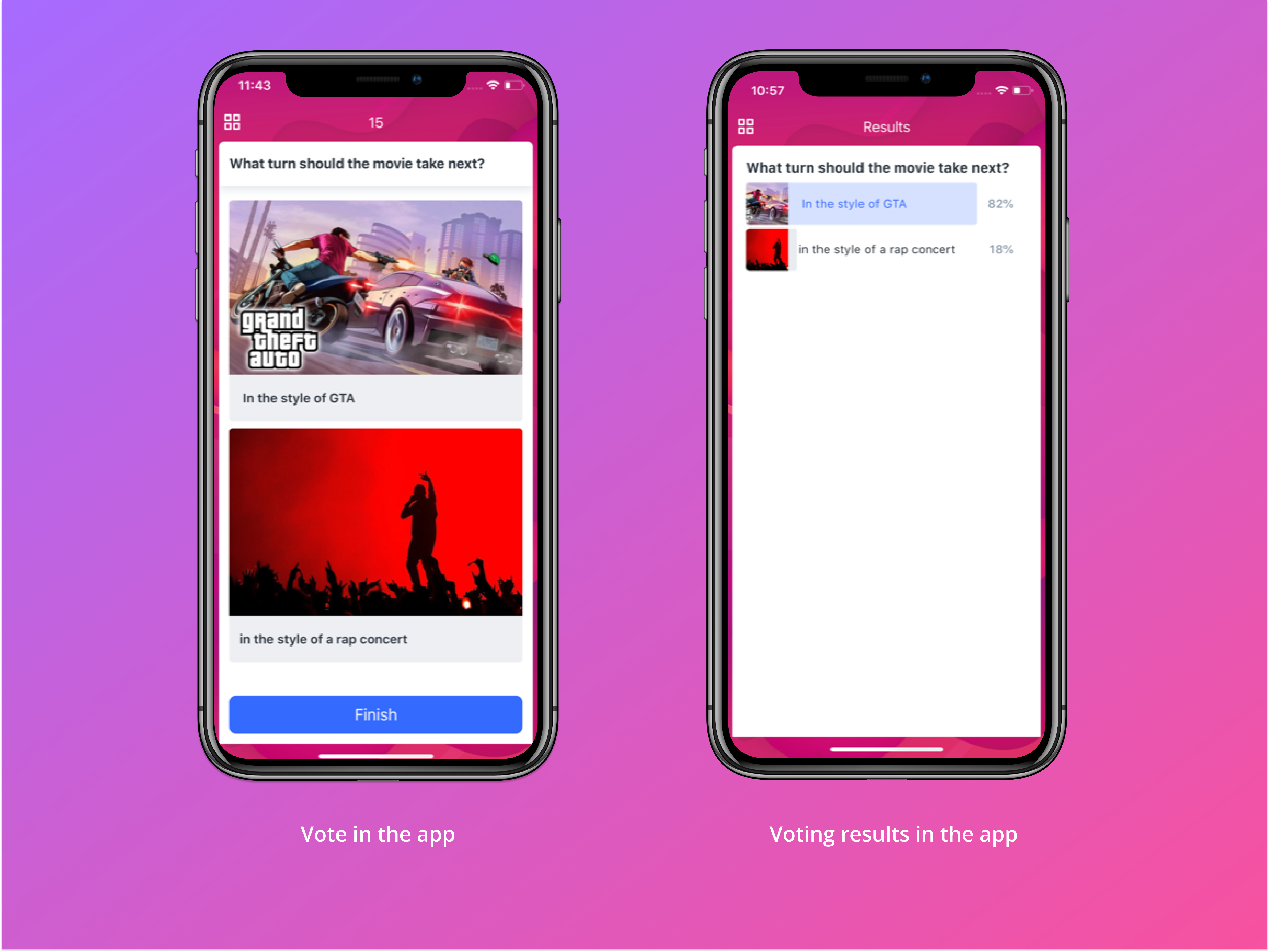 At certain points, the movie was paused to give the viewers time to decide which direction the story should take. The viewers voted in the app and saw the results on their device screens. The presenter announced the storyline that received most votes, and then the next part of the movie was played.
