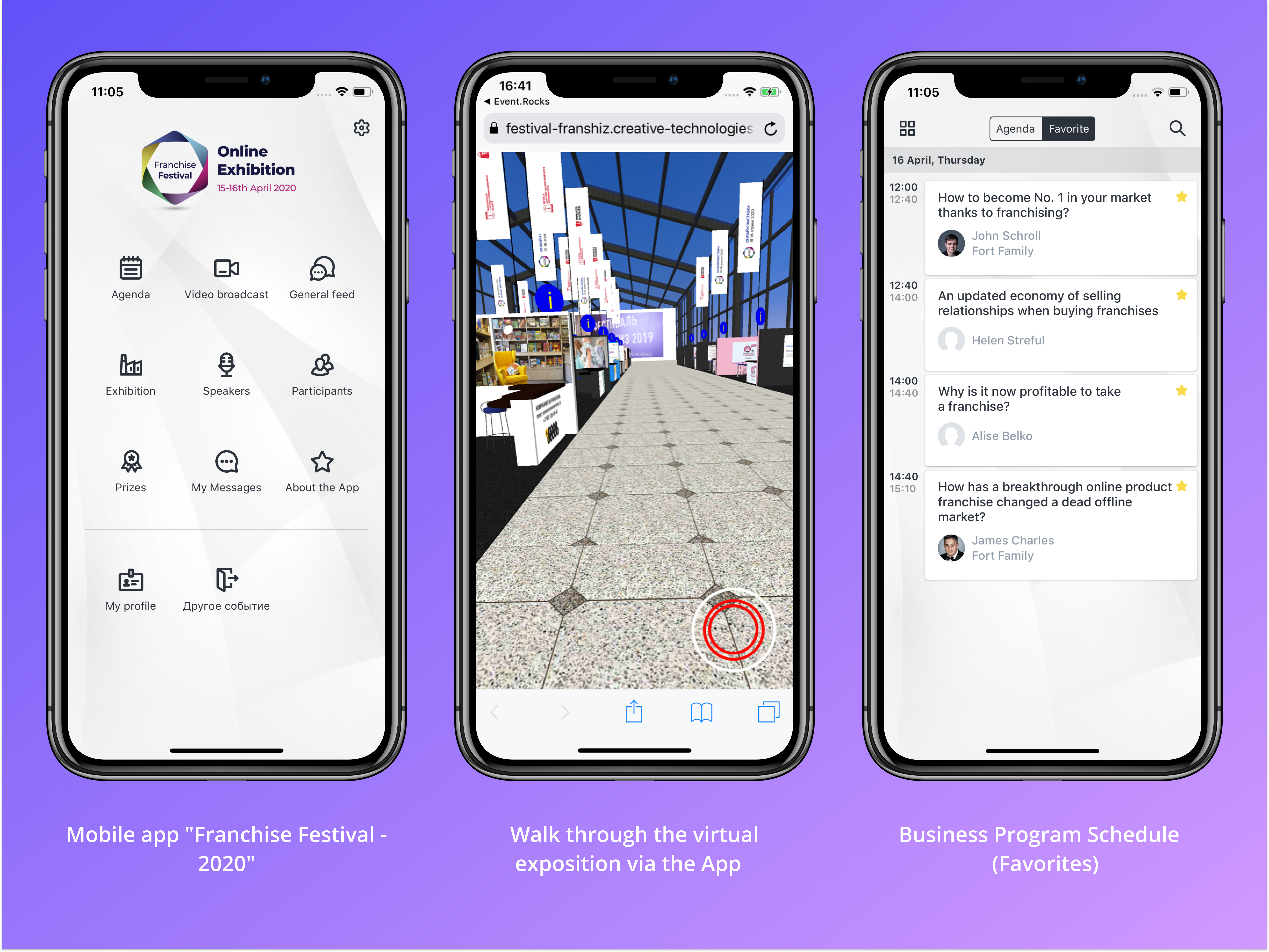 By clicking on the information icon on a stand, attendees could open the catalog section with the company description, franchise terms and conditions, and also photos and videos. From there, they could start a chat with a company representative or apply for the franchise.