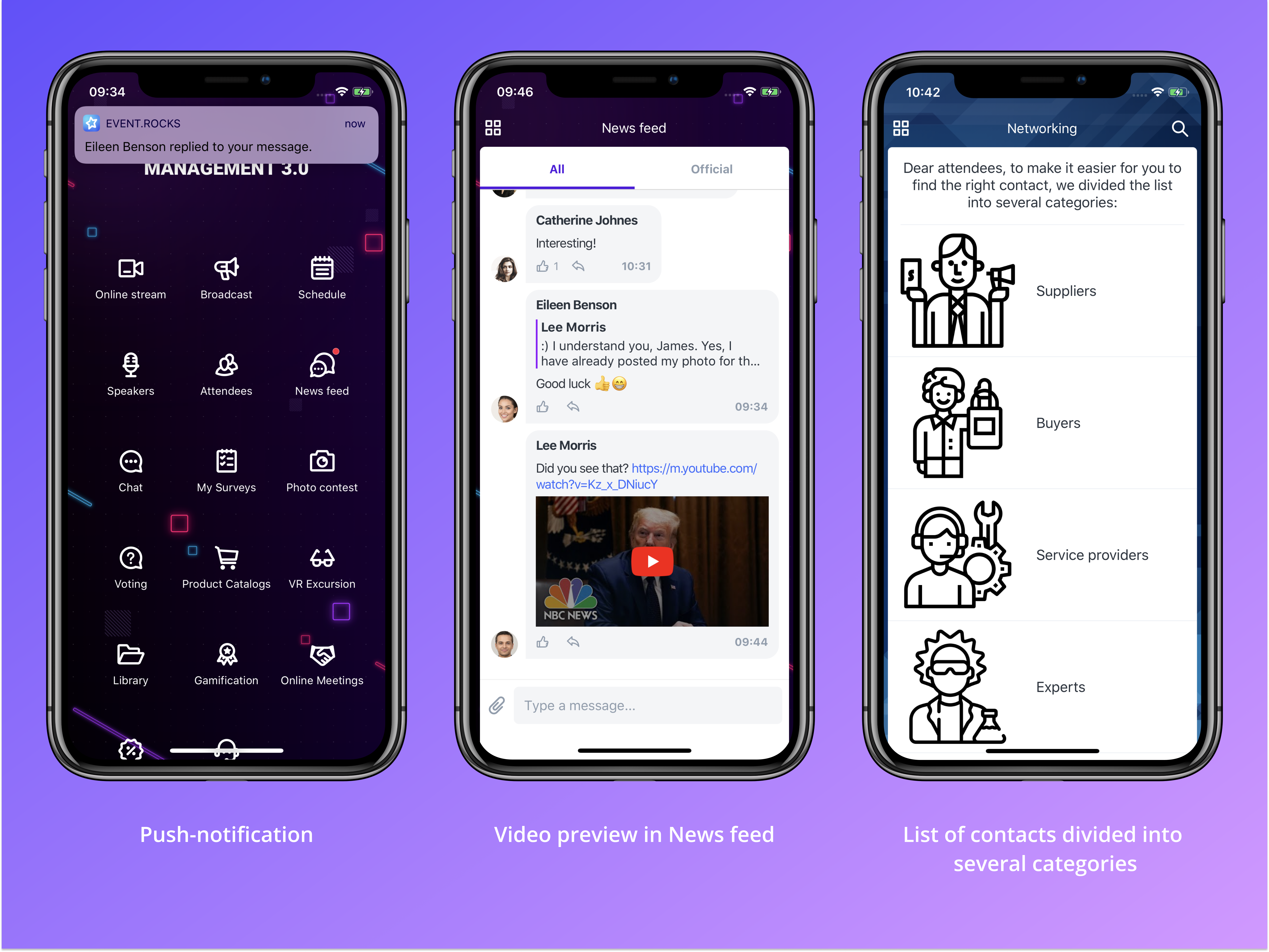 Event.Rocks is a web screen for live broadcast that incorporates one or several parallel streams, attendee chat, interactive features and partners’ banners – all that in addition to the mobile app that delivers communication, networking, interactive sponsor integrations, and everything else you need to implement any scenario, however unique.